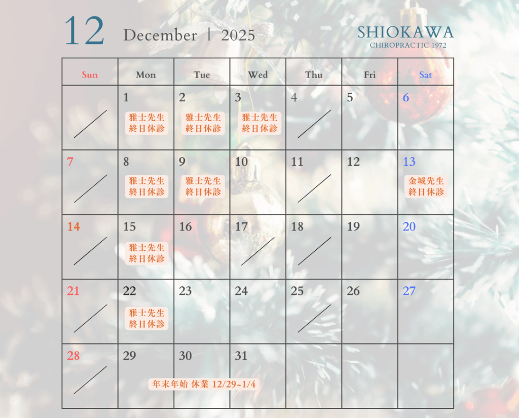 雅士先生終日休診 12月1日(月)、2日(火)、3日(水)、8日(月)、9日(火)、15日(月)、22日(月)